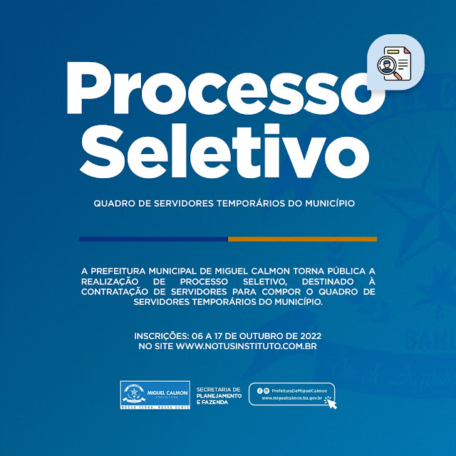As inscrições serão realizadas exclusivamente no site www.notusinstituto.com.br, no período de 06 a 17 de outubro de 2022, com vencimento do boleto até o dia 18 de outubro de 2022. Você também pode acessar o link de inscrição na aba CONCURSO/SELETIVO na página da prefeitura. www.miguelcalmon.ba.gov.br.