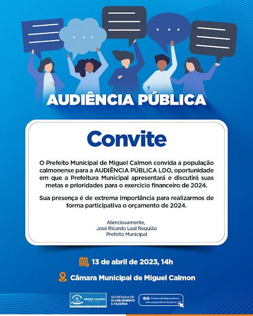 O Prefeito de Miguel Calmon, convida a população calmonense para participar da Audiência Pública LDO, oportunidade em que a Prefeitura apresentará e discutirá suas metas e prioridades para o exercício financeiro de 2024.