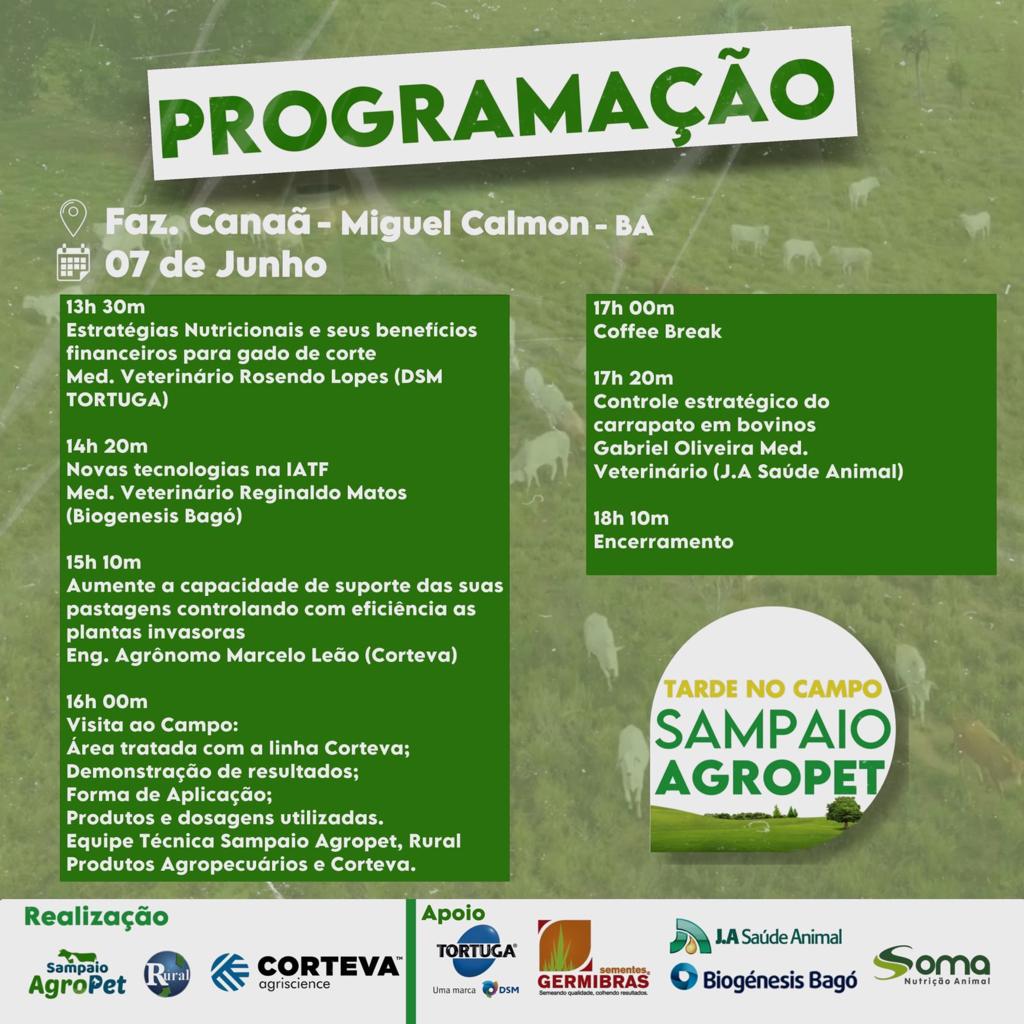 A Sampaio Agropet, que tem lojas em Miguel Calmon e Jacobina-BA, estará promovendo o evento "Tarde no Campo", no dia 07 de junho de 2023, na Fazenda Canaã, localizada no povoado de Faísca, no municipio de Miguel Calmon-BA.